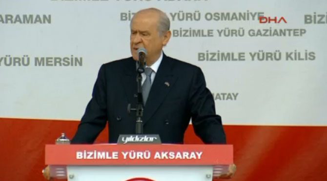 Osmaniye mitinginde Devlet Bahçeli aleyhine tezahürat yapıldığında kalabalığı susturduğunu hatırlatan Başbakan Davutoğlu, “Bizim geleneğimizde bu yoktur. Ama sayın Bahçeli günlerdir bize hakaret ediyor. Günlerdir siyaseti son derece seviyesiz şekilde yapıyor" dedi. Başbakan Davutoğlu, “Diyor ki 'Bana doğuda Serok Ahmet diyorlar batıda Türkmen Ahmet. Osmaniye'de Yörük Ahmet dediler.' Doğru, Erzurum'da Dadaş Ahmet dediler. Doğru Elazığ'a gittim Gakkoş Ahmet dediler o da doğru. İşte buradayım 'Toroslar'ın öz evladı' yazmışsınız, o da doğru. İşte bizim farkımız bu" diye konuştu.