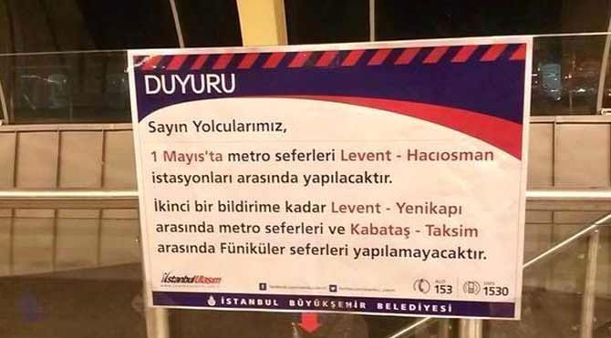 1 Mayıs’ta Taksim’de toplanmanın yasaklanmasıyla ilgili tartışmalar devam ederken Taksim’e yönelik metro ve füniküler seferlerinin de iptal edildiği duyuruldu.