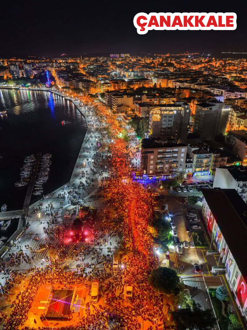 Çanakkale Valiliği’nin düzenlediği fener alayı saat 19.00’da başladı. Binlerce kişi, ellerindeki Türk bayraklarıyla Boğaz ve Garnizon Komutanlığı Bandosu eşliğinde marşlar söyledi, ‘Mustafa Kemal’in Askerleriyiz’, ‘Ne Mutlu Türküm Diyene’ sloganları atıp kordon boyuna ulaştı.