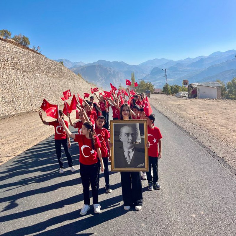 Hakkari Çukurca’da çocuklar, bayraklı tişörteleriyle Atatürk posteri taşıyarak bayramı kutladı.
