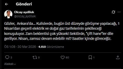 Olcay Aydilek'in paylaşımına göre kulislerde, bugün üst düzeyde görüşme yapılacağı, 1 Nisan'dan geçerli elektrik ve doğal gaz tarifelerinin şekilleneceği konuşuluyor.