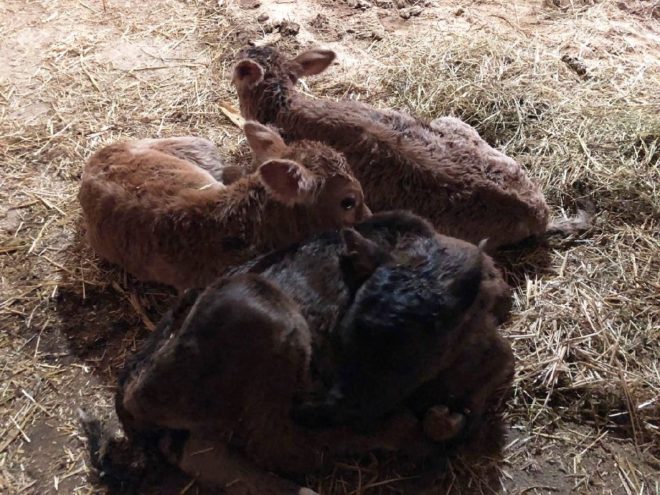 Önceki gün doğum sancısı tutan inek için tekrar veteriner hekim çağırıldı. Uzun uğraş sonucu doğum başarılı bir şekilde gerçekleştirilirken, inek tek batında üçüz doğurdu.