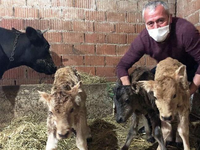 Üçüz buzağıları olan Mesut Akıncı, "İneğimiz doğumunu yaptı ve üçüz oldu. Hayvanlarımız sağlıklı, şu anda bundan dolayı çok mutluyum" diye konuştu.