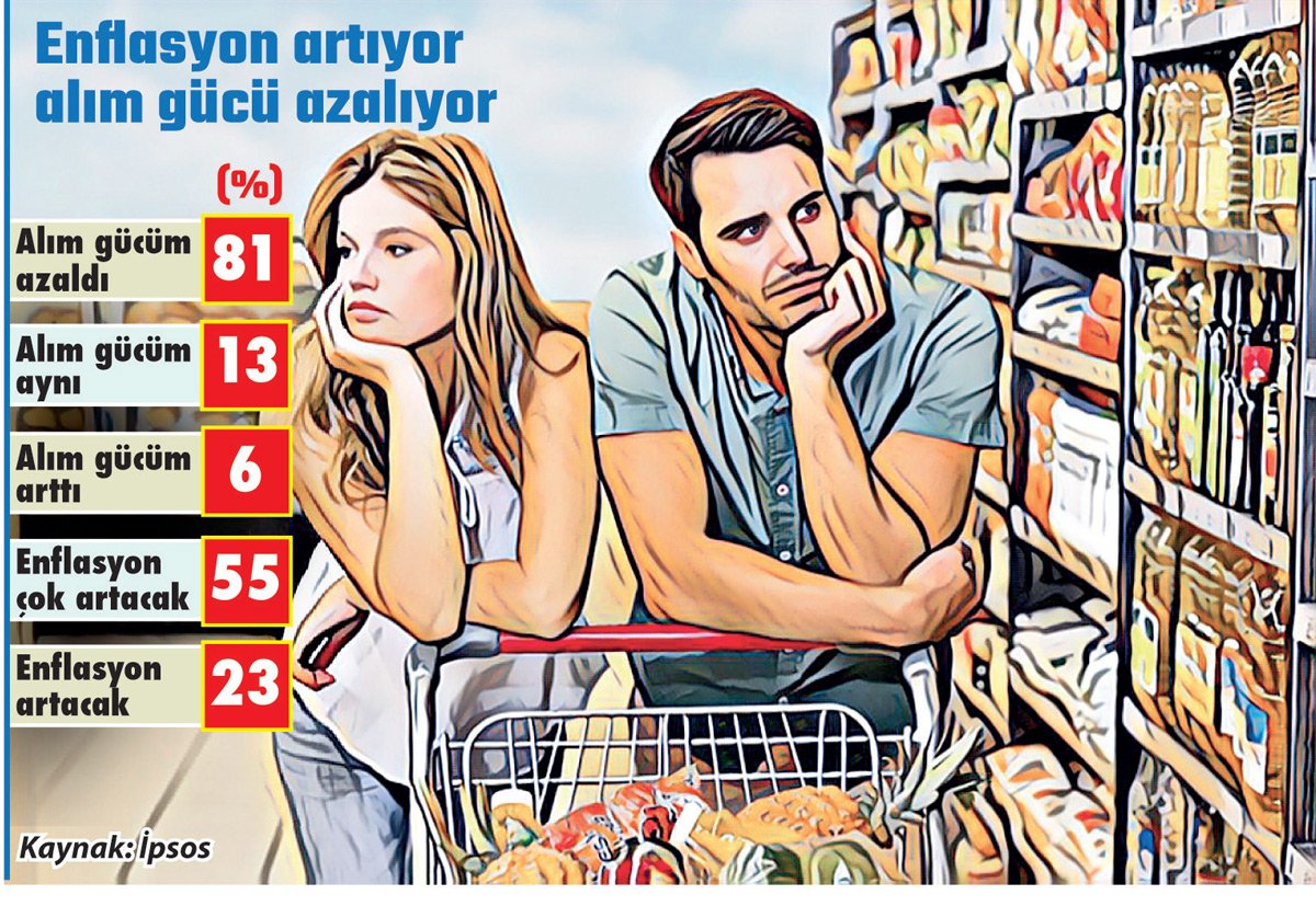 Türkiye’de artış bekleyenler toplam yüzde 78 oldu. Türkiye’de enflasyonun çok artacağını düşünenler yüzde 55, artacak diyenler de yüzde 23 olarak kaydedildi. Türkiye’de son bir ay düşünüldüğünde alım gücünüzde nasıl bir seyir görüldü sorusuna alım gücünün azaldığını söyleyenler yüzde 81, aynı kaldı diyenler yüzde 13 oldu. 28 ülkede toplumun yarısı gelecek altı ay içinde faturalarını ödeyebilme konusunda endişeli çıkarken, Türkiye’de endişeli olanların oranı yüzde 63 olarak izlendi.