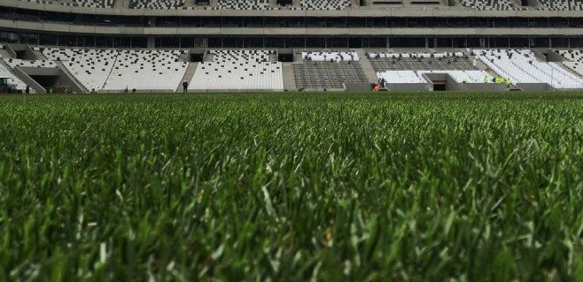 Bir nevi doğa ile teknolojinin güçlerini birleştirmesi ile oluşturulan hibrit çim; milyonlarca yapay lif ile güçlendirilen doğal çim anlamına geliyor. Bu sayede sahada çim kalkmalarının kolay kolay yaşanmadığı ve yeşilin en güzel tonlarıyla taraftarı selamladığı bir saha görüntüsü ortaya çıkıyor .