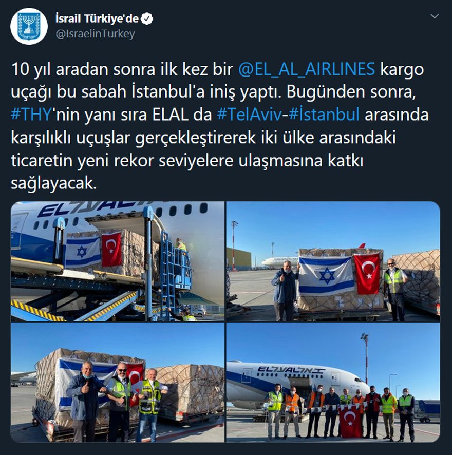 "10 yıl aradan sonra ilk kez bir @EL_AL_AIRLINES kargo uçağı bu sabah İstanbul'a iniş yaptı. Bugünden sonra, #THY'nin yanı sıra ELAL da #TelAviv-#İstanbul arasında karşılıklı uçuşlar gerçekleştirerek iki ülke arasındaki ticaretin yeni rekor seviyelere ulaşmasına katkı sağlayacak."