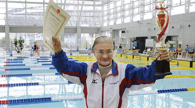 Spiegel Online'nın haberine göre, yaşlı kadın bir Japon yüzme kulubünün uzunluğu 25 metre olan havuzunda bin beş yüz metre yüzdü. 1 saat 15 dakika ve 54 saniyede bin beş yüz metre yüzen kadın 100-104 yaş grubunda dünya rekoru kırdı. Serbest stilde yüzen kadın, bu rekoru ile Guinness rekorlar kitabına girmeyi başardı. Normal sporcularda 1500 metre Dünya rekoru rekoru 15 dakika ve 28 saniye ile Amerikalı Katie Ledecky'e ait.