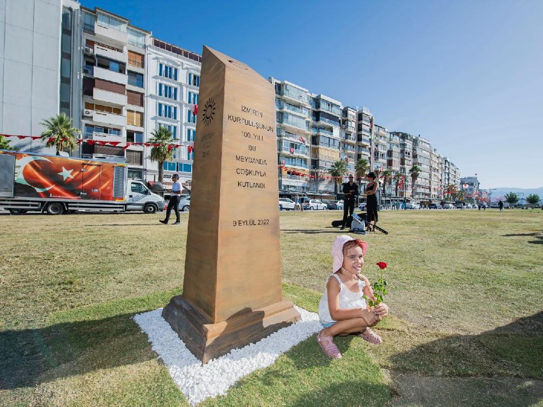 100. Yıl Anı Taşı, Kültür ve Sanat Şube Müdürlüğü Plastik Sanatlar Şefliği heykeltıraşlarından Onur Eray tarafından tasarlandı. Asimetrik levhalardan oluşan prizmatik formdaki anı taşı, “corten” çelik adı verilen özel bir malzemeden yapıldı. Anı taşı birleştirilmiş beş levhadan oluşuyor. En üst levhaya ay-yıldız işlendi. Eserin ön tarafı olarak tanımlanabilecek yüzeyinde, İzmir’in kurtuluş gününün anlamını betimleyen bir yazı ve tarih bulunuyor. Diğer üç yüzeyde ise “Umudun Yüzü İzmir”, “Demokrasinin Yüzü İzmir” ve “Barışın Yüzü İzmir” yazıları yer alıyor.