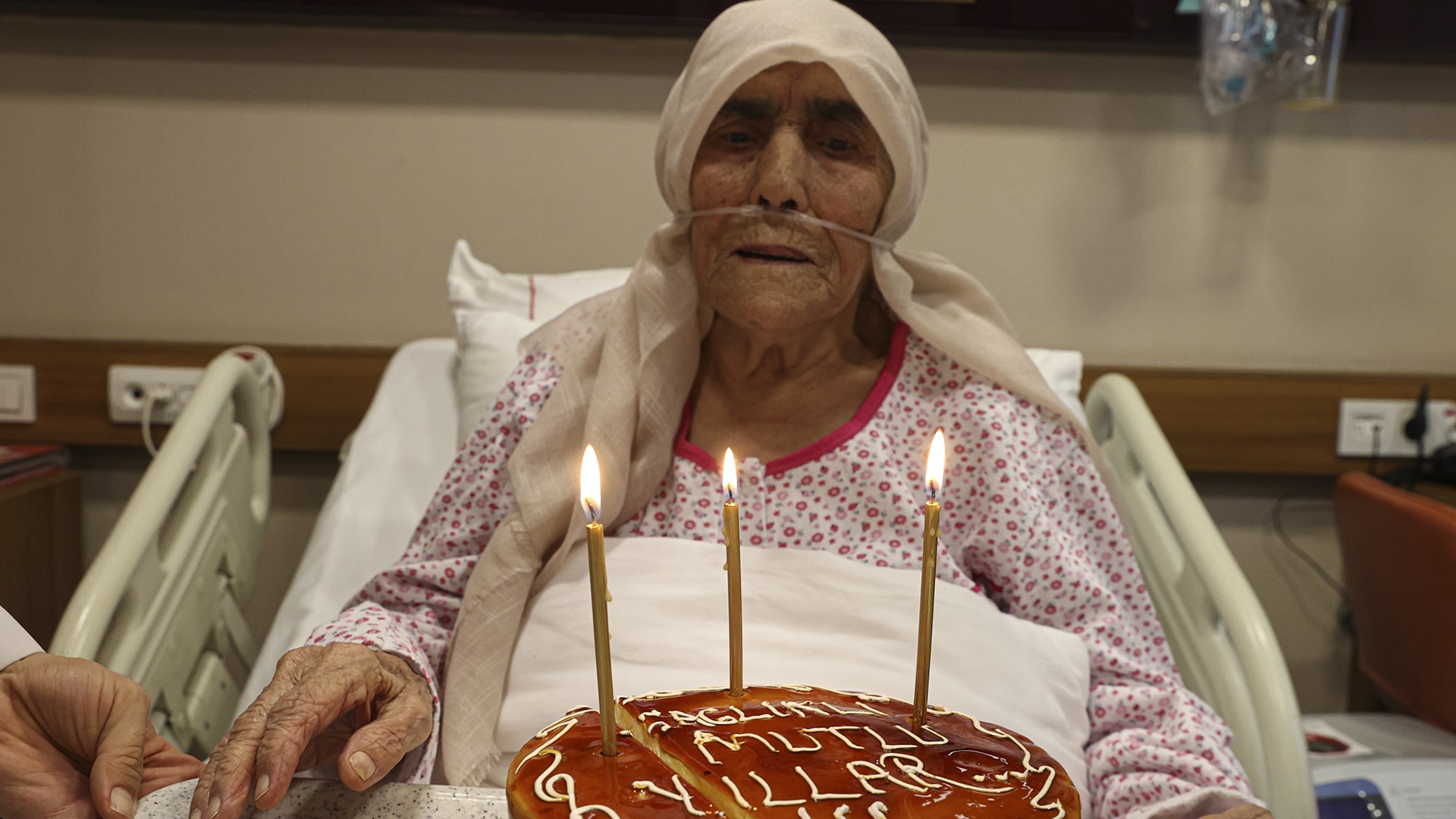 Alkışlar eşliğinde kendisi için hazırlanan pastadaki mumları üfleyen Hatice nine taburcu edildi.