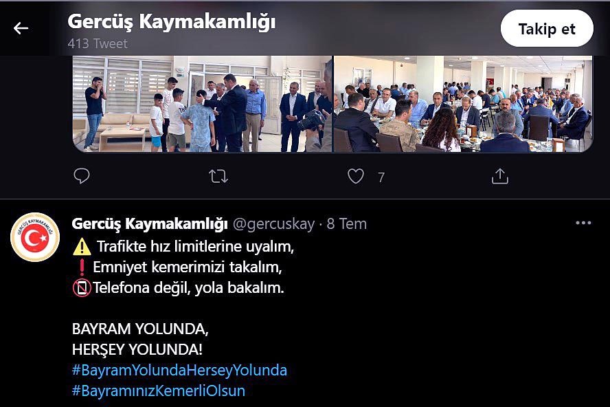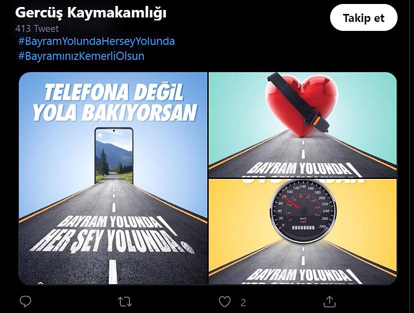 Kaymakamın, 9 günlük Kurban Bayramı tatili öncesinde, kaymakamlığın resmi sosyal medya hesabından bazı görsel fotoğraf paylaşımlarında bulunarak trafik kazaları konusunda farkındalık yarattığı, önemli uyarılarda bulunarak trafik kazalarına neden olan hız limitinin aşılmaması, emniyet kemerinin mutlak suretle takılması, cep telefonuyla kesinlikle konuşulmaması gibi paylaşımlar yapması dikkat çekti.