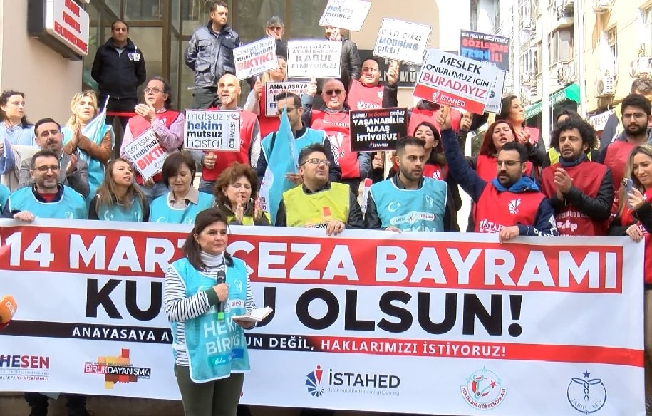 14 Mart Tıp Bayramı nedeniyle bir araya gelen İstanbul Aile Hekimliği Derneği (İSTAHED), Aile Hekimliği Çalışanları Sendikası (AHESEN), Birlik ve Dayanışma Sendikası (BDS), Hekim Birliği Sendikası, Tabib-Sen ve Genel Sağlık-İş Sendikası üyelerinden oluşan bir grup, 1 Mart 2024 tarihinde Resmi Gazete'de yayınlanarak yürürlüğe giren torba yasayı protesto etti. İstanbul İl Sağlık Müdürlüğü önünde toplanan bazı sağlık çalışanları dövizler açarak slogan attı.