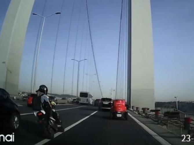 15 Temmuz Şehitler Köprüsü'nde 23 Nisan Cumartesi günü motosiklet sürücülerinin hem kendilerini, hem de diğer sürücülerin hayatını riske atarak hatalı sollama yaptığı ve emniyet şeridini kullandıkları belirlendi. Köprünün üzerinde ilerleyen motosiklet, süratle ilerlerken bir de hatalı sollama yaptı.