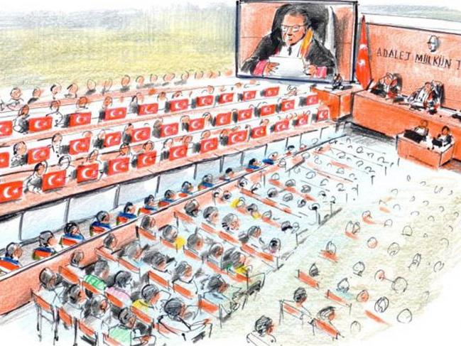 Mahkemeye 34 şehidi temsilen 34 Türk bayrağı müşteki kısmındaki masalara getirildi. Salon karakalem çalışmasıyla resmedildi.