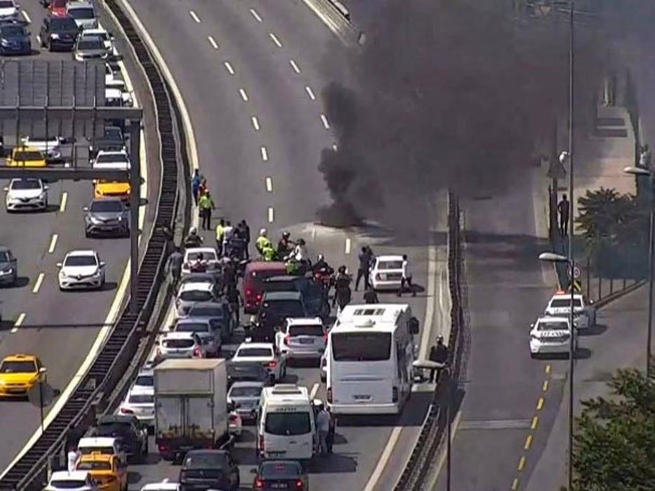 Diğer sürücüler yangın tüpleriyle alevlere müdahale etmeye çalıştı. Gelen itfaiye ekipleri, motosikletteki yangını kısa sürede söndürdü. Çalışmaların ardından trafik akışı normale döndü. (DHA)
