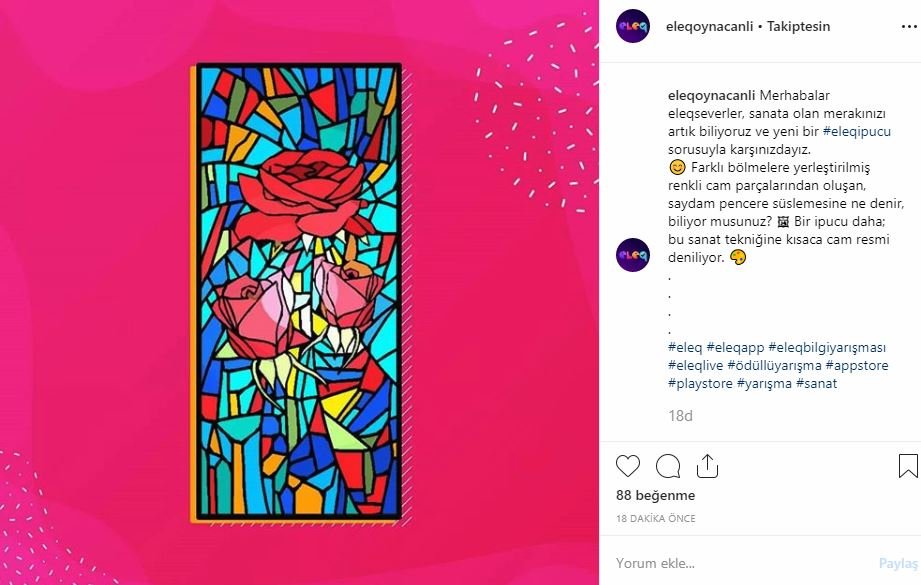 Eleq her gün çeşitli konularda sorularını yarışmacılara yöneltiyor. Instagram sayfasından yayınlanan Eleq ipucu sorusu şöyle: "Merhabalar eleqseverler, sanata olan merakınızı artık biliyoruz ve yeni bir eleqipucu sorusuyla karşınızdayız.Farklı bölmelere yerleştirilmiş renkli cam parçalarından oluşan, saydam pencere süslemesine ne denir, biliyor musunuz? Bir ipucu daha; bu sanat tekniğine kısaca cam resmi deniliyor."