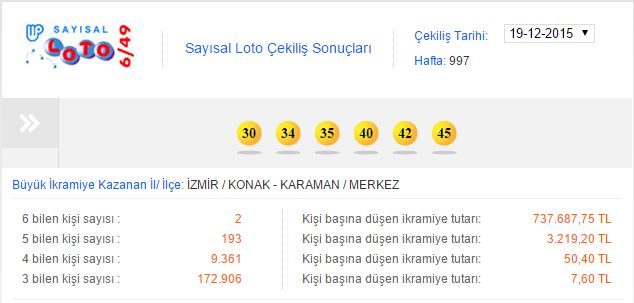 SAYISAL LOTO SONUÇLARI 19.12.2015