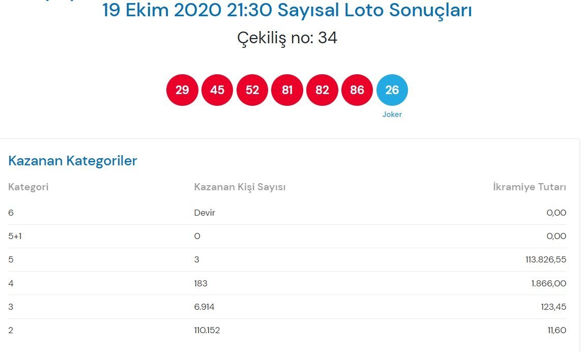 19 EKİM SAYISAL LOTO SONUÇLARI
