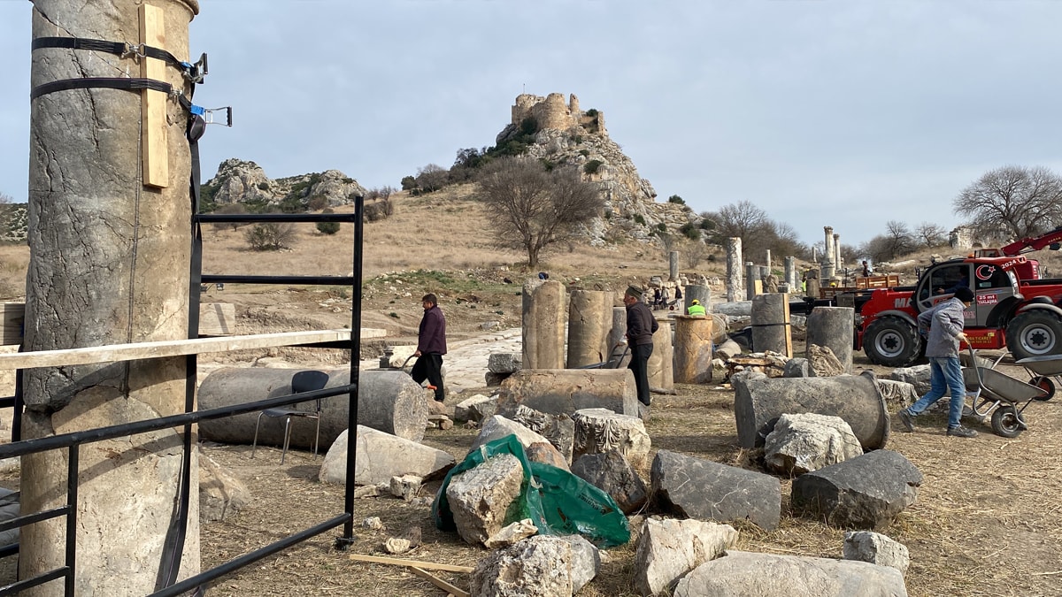 İl Kültür ve Turizm Müdürü Burhan Torun, depremlerde hasar gören ve yıkılan sütunlu yolda da ayağa kaldırma çalışmalarının yapıldığını belirterek, “Sütunlu yolda depremde hasar almış ve depremde yıkılmış olan sütunları, kazı başkanımız ve ekibiyle müze müdürlüğü ekibimiz ayağa kaldırmakta ve yine burayla ilgili zarar görmüş olan yerlerle ilgili restorasyon projesi devam etmektedir.Geleceğe Miras Projesi kapsamında burayla ilgili çevre düzenlemesi, kazı çalışması, proje çalışması ve restorasyonla ilgili yaklaşık alanda 45 işçimizle birlikte çalışmalarına devam ediyor. Yine buraya güneş enerji sistemi ile getirdiğimiz ışıklandırma sistemini de eklemiş durumdayız. Dolayısıyla tiyatro alanıyla, bodrum kalesiyle, kilise kalıntısıyla, hamamıyla tam bir antik kentteyiz. Milattan sonra 2’nci yüzyıla tarihlendirebileceğimiz ama yeni bulunan tapınakla birlikte daha erkene gidebilecek bir alandayız” dedi.