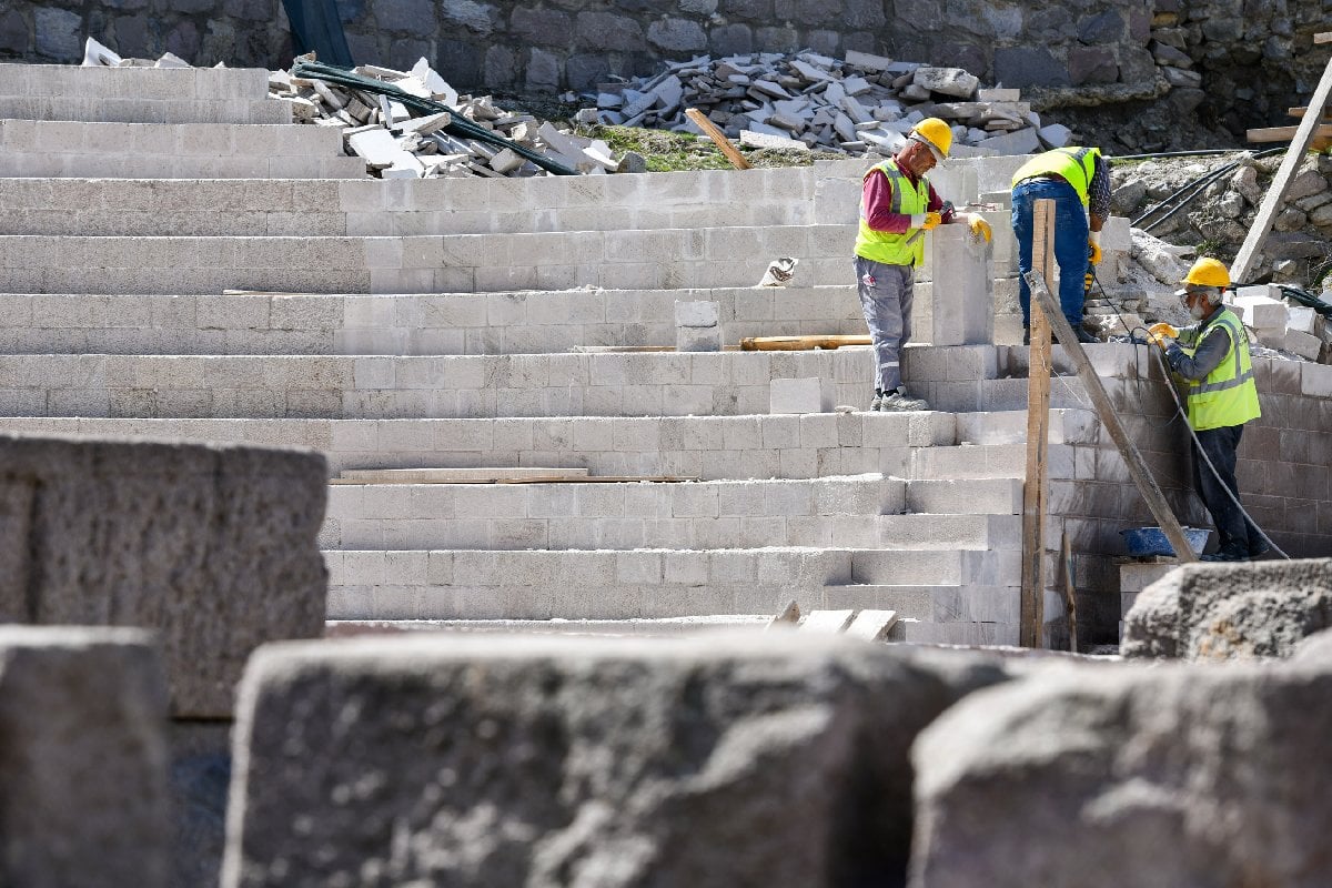 Cavea’nın (oturma sıraları) ilk iki sırası taraklanmış gri bej damarlı Afyon mermer blokları, üst sıraları ise andezit plak taş kullanılarak tamamen el işçiliği ile restore edilirken, sahne çelik üstüne ahşap bir platform kaplanacak.