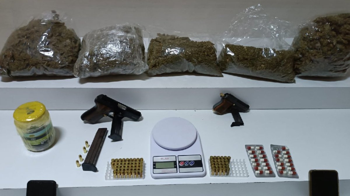 Baskın düzenlenen adreste, polisin peşindeki Şahin T. gözaltına alındı. Narkotik, yaralama ve ruhsatsız silah suçlarından kaydı olan şüphelinin adresinde yapılan aramalarda, 6 parça halinde toplam 2 kilo 697 gram mariuhana, 27 adet sentetik ecza hap, 2 adet ruhsatsız tabanca ve 72 mermi ele geçirildi. Narkotik madde ticaretinden elde edildiği değerlendirilen 3 bin 290 liraya da el konuldu.