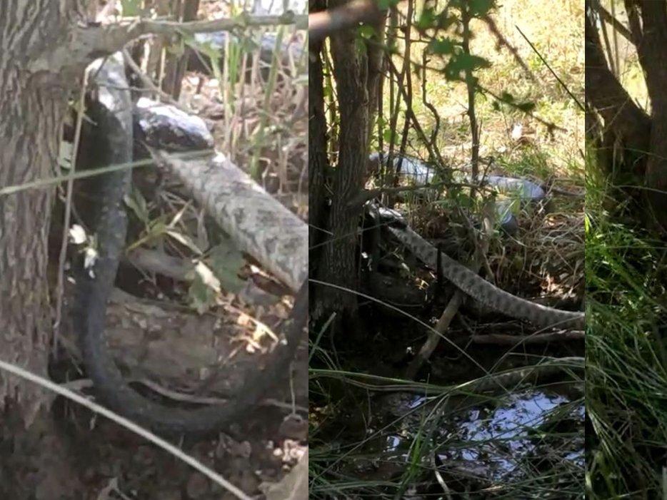 Şırnak'ın Uludere ilçesine bağlı Şenoba beldesinin piknik alanında 2 metrelik siyah yılan, kendi boyundaki gri benekli yılanı yemesi saniye saniye telefona kaydedildi.
