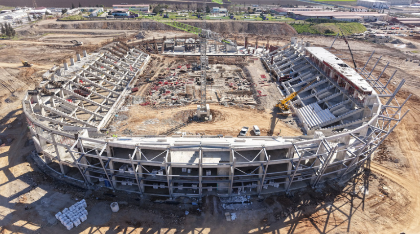 Şehrin en önemli ihtiyaçlarından biri olan stadyum projesinde çalışmalar tüm hızıyla devam ediyor. Dulkadiroğlu İstasyon Mahallesi’nde hayata geçirilen modern stadyum projesinde önemli aşamalar geride bırakılırken, inşaat sahasında yoğun bir mesai yürütülüyor. Toplam 2 Milyar TL’lik yatırımla şehre kazandırılan yeni stadyumun temel imalatları ve ana taşıyıcı sisteminin büyük bölümü tamamlandı. Proje kapsamında tribünlerin önemli bir kısmı da inşa edilirken, saha çevresindeki yapı elemanları ve tribün montaj çalışmaları eş zamanlı olarak sürdürülüyor. İnşaat sahasında yürütülen çalışmalar kapsamında kuzey, doğu ve batı tribünlerinde üçüncü kata ulaşılırken, güney tribünün inşası da büyük bir hızla ilerliyor. Tribün bloklarının yükselmesiyle birlikte stadyumun genel silueti de her geçen gün daha belirgin hale geliyor.
