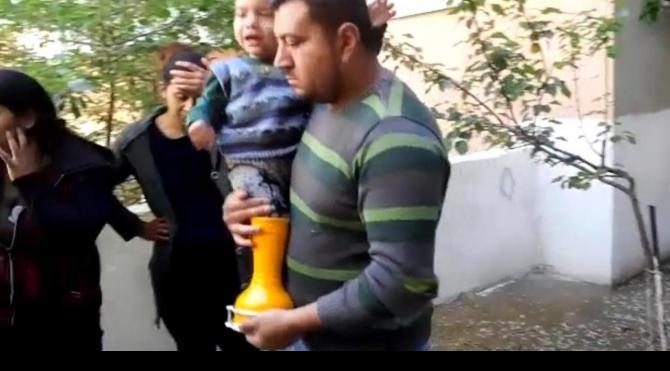 Eve gelen itfaiye erleri, önce ağlayan çocuğu sakinleştirdi ,daha sonra ise demir kesme makasıyla darbukayı kesip sıkışan ayağını kurtardı.