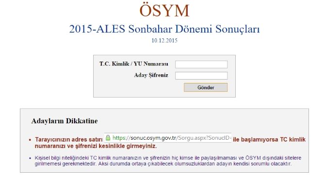 Söz konusu ALES sonuçları ÖSYM'nin duyurusunda da açıklandığı üzere ÖSYM sonuç sayfasına T.C. Kimlik veya YU Numarası ve şifre ile giriş yapılarak öğrenilebiliyor. Sonuç sayfasına direkt erişebilmeniz için ilgili bağlantıyı aşağıda paylaştık. Açılan sayfada ilgi alanlara T.C. Kimlik veya YU Numaranızı ve şifrenizi girmeniz yeterli.