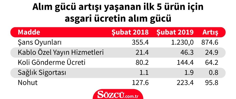 Asgari ücretlinin alım gücünü arttırdığı ilk beş ürün ise sırasıyla şans oyunları, kablo özel yayın hizmetleri, koli gönderme ücreti, sağlık sigortası ve nohut oldu. Asgari ücretlinin alım gücü nohutta bir önceki yılın aynı ayına göre 96 kilo arttı.