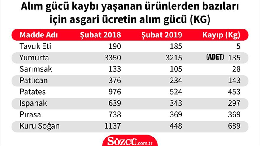 Asgari ücretlinin yüksek düzeyde alım gücü kaybı yaşadığı ürünlerin bazıları için kayıp oranları; teflon mutfak eşyaları yüzde 38, kalemde yüzde 11.25, kömürde yüzde 9.7, buzdolabında yüzde 18.5, bilgisayarda yüzde 17.5, okul defterinde yüzde 12 oldu.