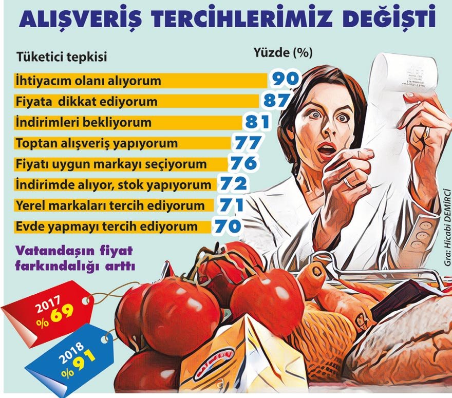 Araştırma şirketi Nielsen tarafından hazırlanan ve değişen tüketici alışkanlıklarını ortaya koyan rapora göre, artan fiyatlar karşısında tüketicilerin ilk 3 aksiyonu sadece ihtiyaçları olan ürünleri almak, fiyatlara daha çok dikkat etmek ve indirim zamanı alışveriş yapmak oldu. Rapora göre, fiyatlarla birlikte tüketicinin alım gücündeki değişiminin ev bütçesi de etkilenirken, giyim, dışarıda yemek ile kişisel bakım ve kozmetik grupları halihazırda en çok tasarrufa gidilen kategoriler oldu. Raporda, yaşanan bu fiyat değişimleri ve ekonomik kriz ortamında tüketicilerin yakın gelecekte ise dışarıda yemek, tatil ve elektronik ürünler kalemlerinden tasarruf etmeyi planladıklarına işaret edildi.