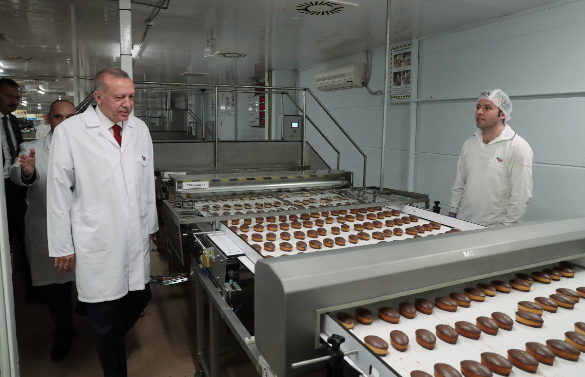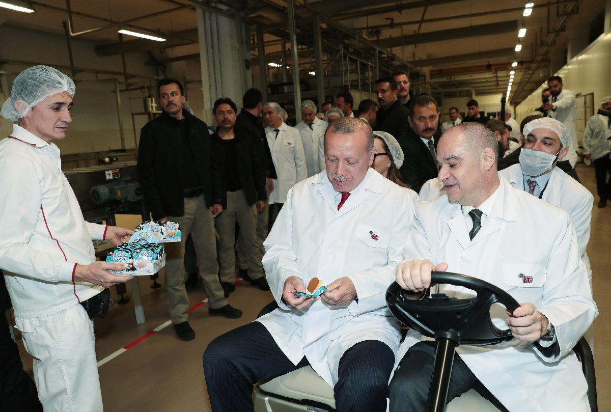ETİ Fabrikası'nda incelemelerde bulunan Erdoğan'a ETİ Gıda Şirketler Grubu Yönetim Kurulu Başkanı Ahmet Firuzhan Kanatlı, fabrikayı gezdirerek bilgi verdi.