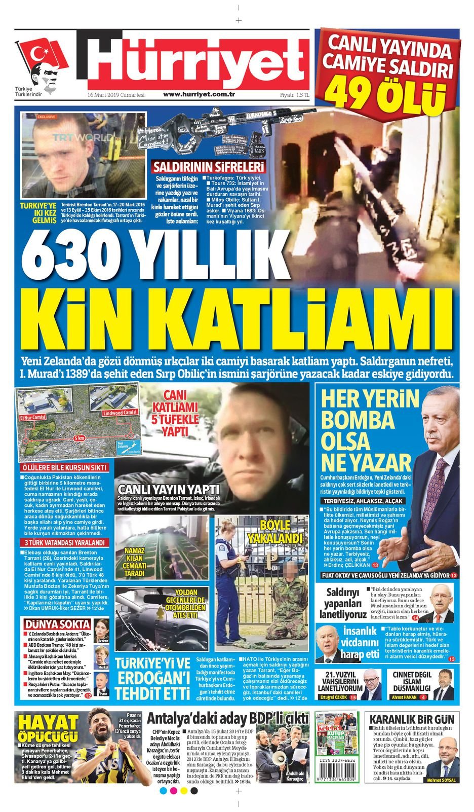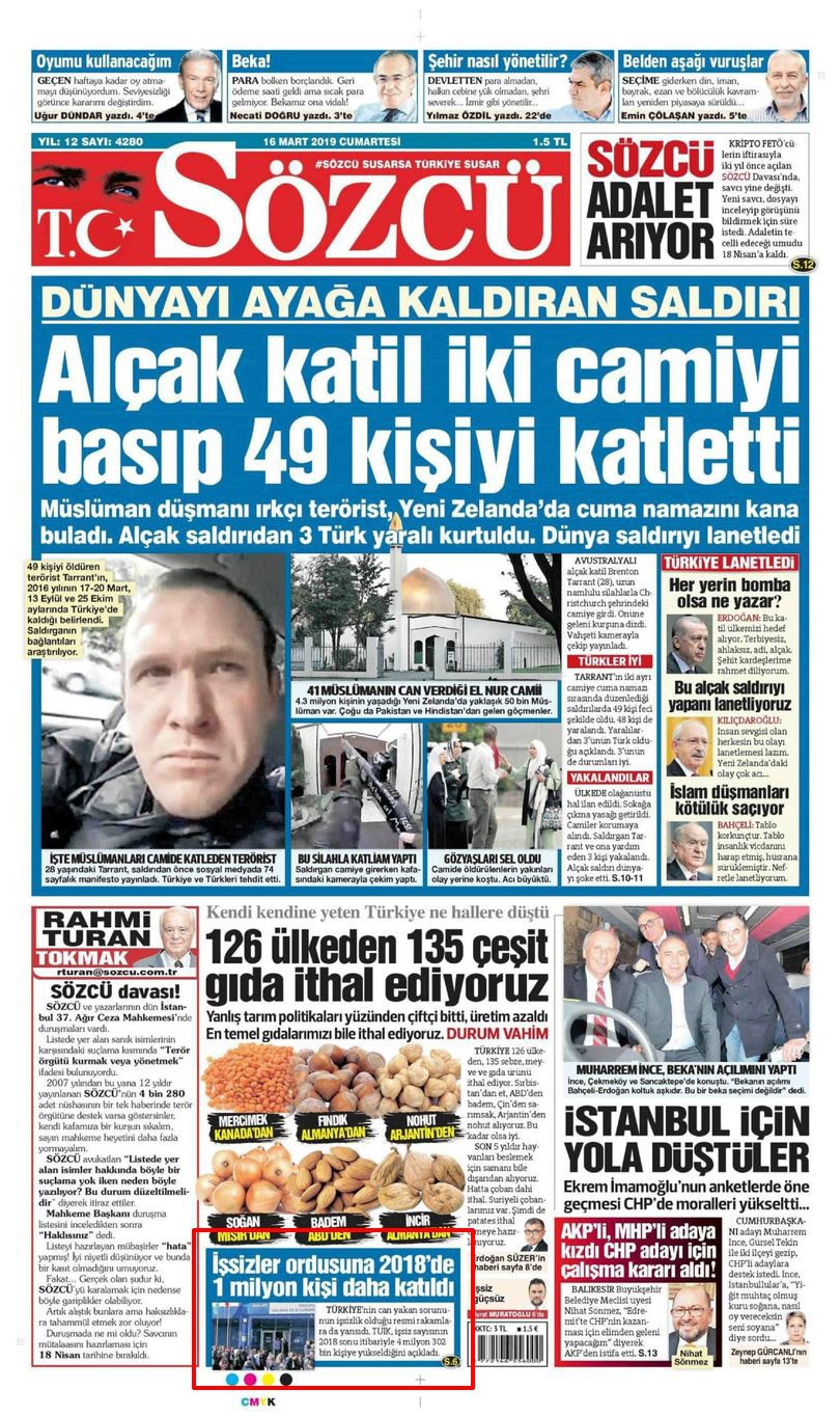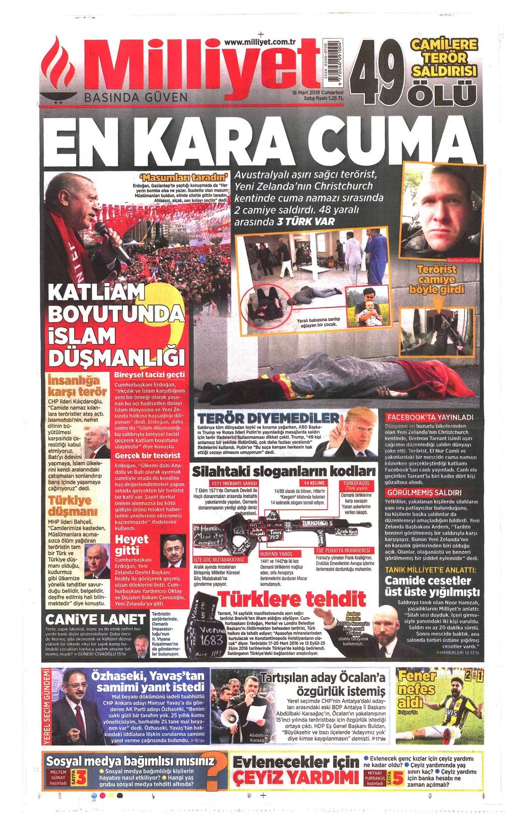 Yeni Zelanda'da ibadet eden Müslümanları hunharca katleden psikopat Brenton Tarrant 49 kişiyi öldürdü. Dünya bu haberle yas tutarken Türkiye'de gazeteler birinci sayfalarında bu habere geniş yer ayırdı. Kimi gazeteler birinci sayfalarını tamamen bu habere ayırırken bu haberin yanında okurlarına başka haberler gösteren gazeteler de oldu. Türkiye'de dün işsizlik tarihi zirve yaptı. 4 milyon 300 bin kişi işsiz olarak kayıtlara geçti. Son bir yılda 1 milyonun üzerinde insan işsizler ordusuna katıldı. Türkiye'de işsizlik büyük bir sosyal yaraya dönüştü. Bazı gazeteler işsizlik rakamlarını okurlarına iç sayfalarında küçük puntolar ile duyurdu.