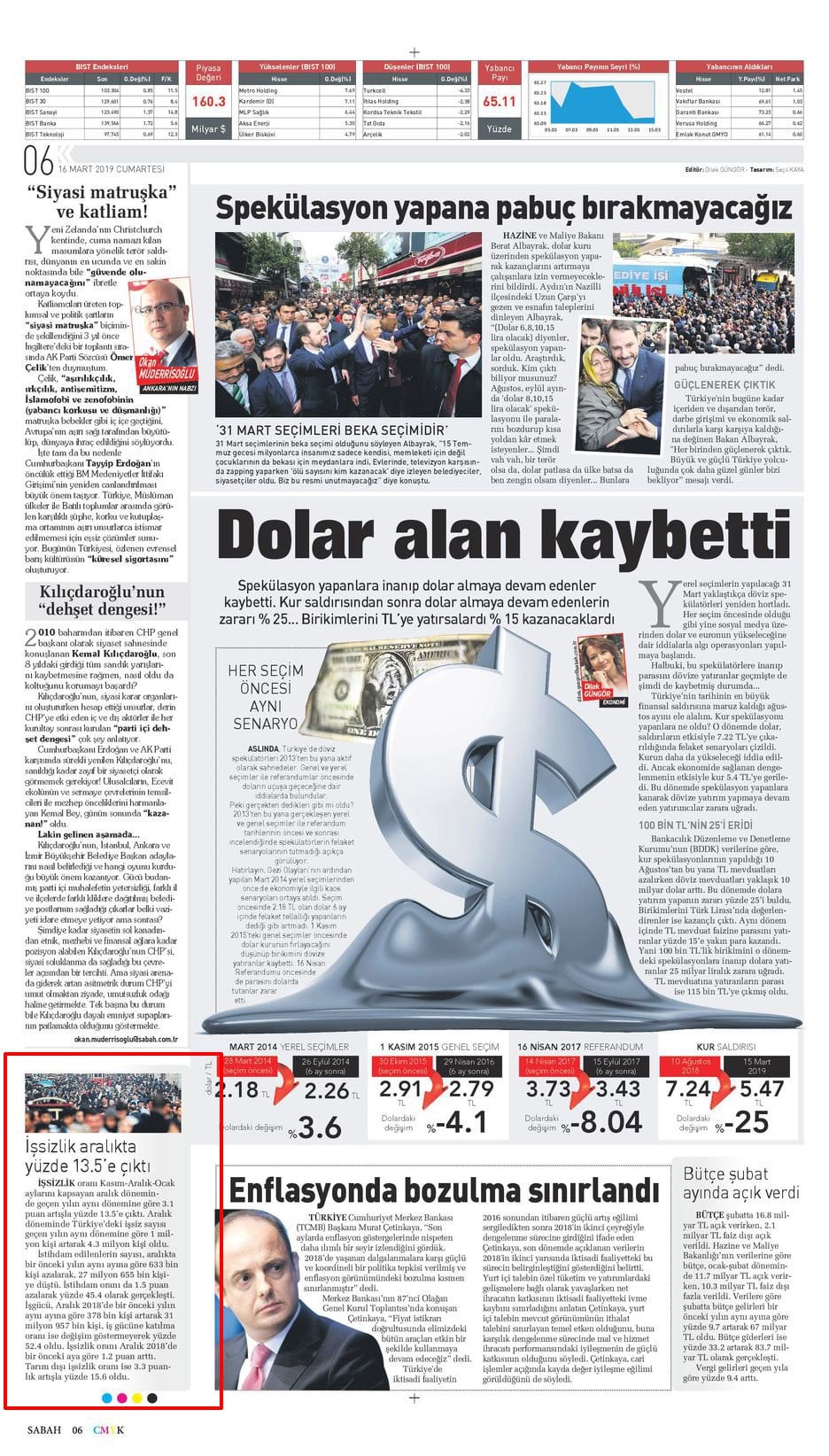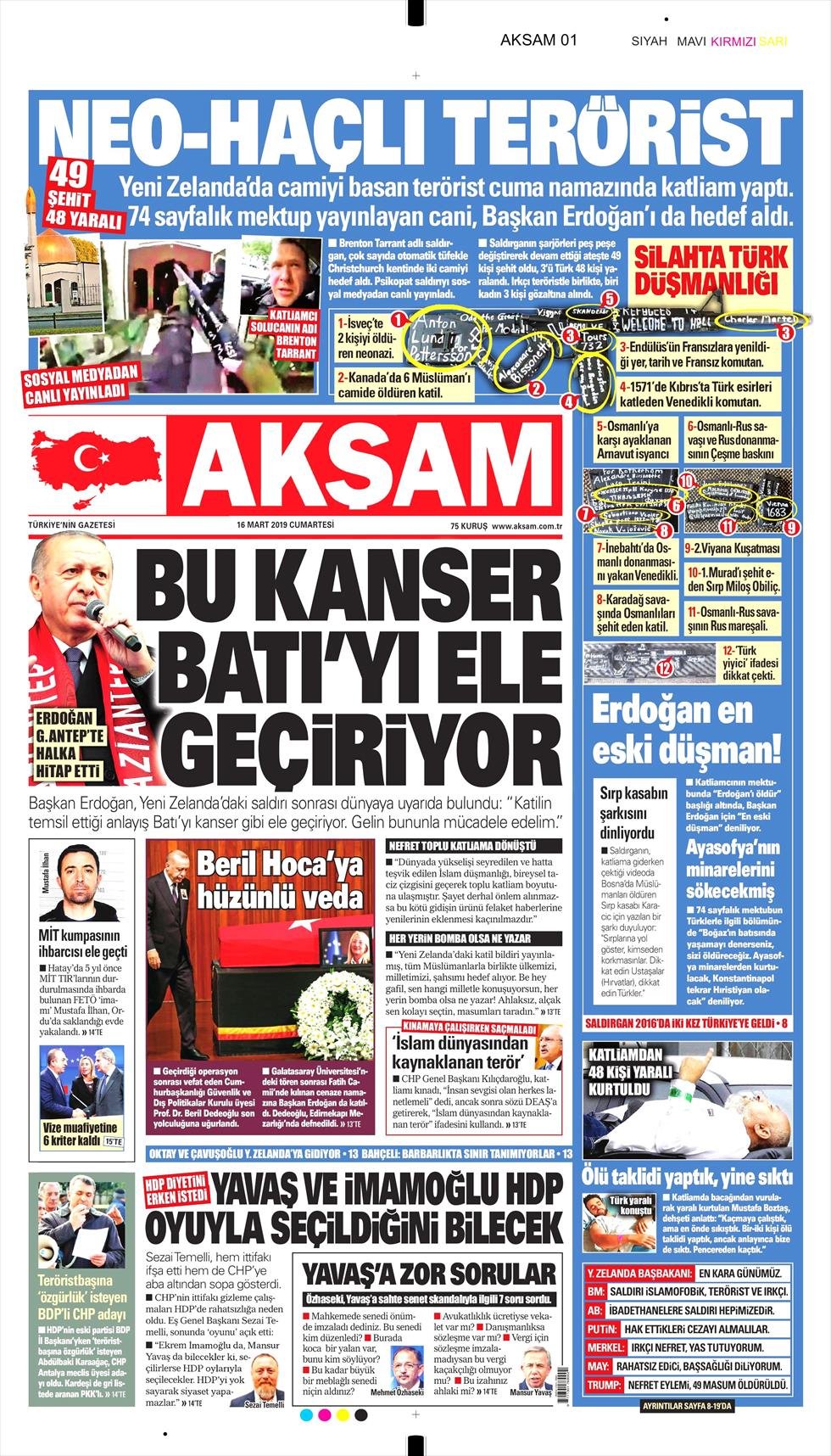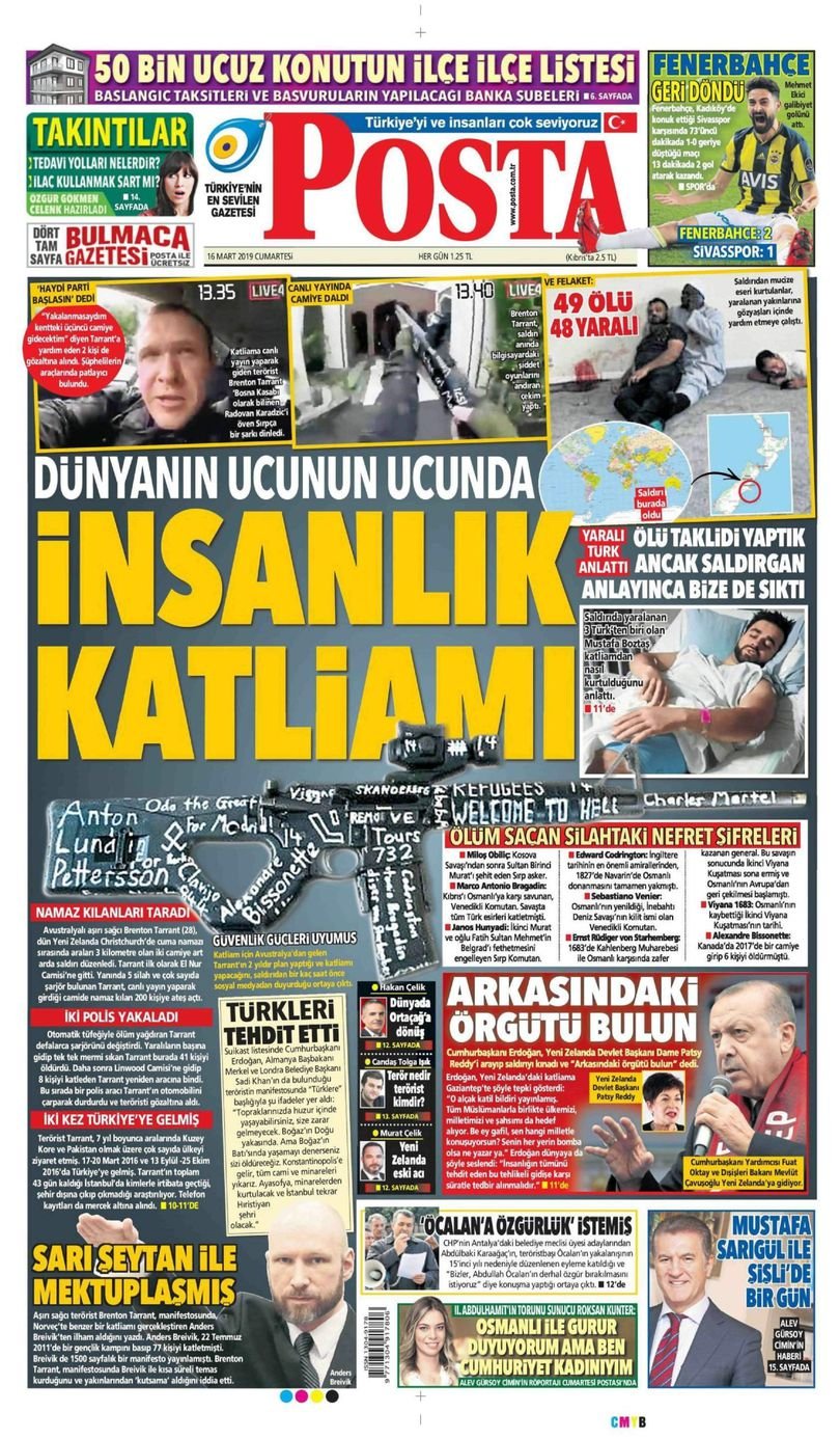 Yeni Zelanda'da ibadet eden Müslümanları hunharca katleden psikopat Brenton Tarrant 49 kişiyi öldürdü. Dünya bu haberle yas tutarken Türkiye'de gazeteler birinci sayfalarında bu habere geniş yer ayırdı. Kimi gazeteler birinci sayfalarını tamamen bu habere ayırırken bu haberin yanında okurlarına başka haberler gösteren gazeteler de oldu. Türkiye'de dün işsizlik tarihi zirve yaptı. 4 milyon 300 bin kişi işsiz olarak kayıtlara geçti. Son bir yılda 1 milyonun üzerinde insan işsizler ordusuna katıldı. Türkiye'de işsizlik büyük bir sosyal yaraya dönüştü. Bazı gazeteler işsizlik rakamlarını okurlarına iç sayfalarında küçük puntolar ile duyurdu.