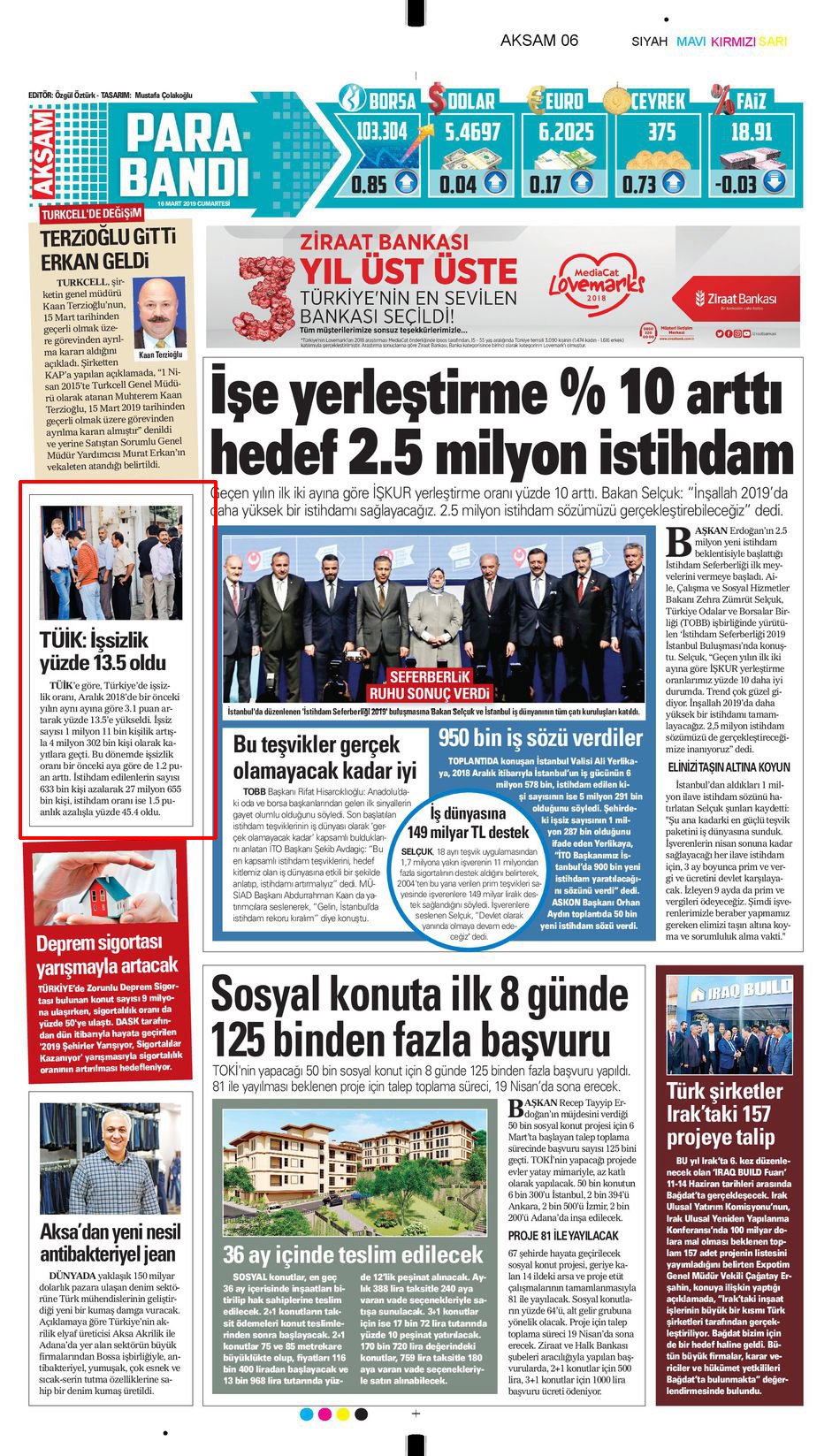Akşam Gazetesi işsizlik rakamlarını iç sayfasından şöyle gördü: