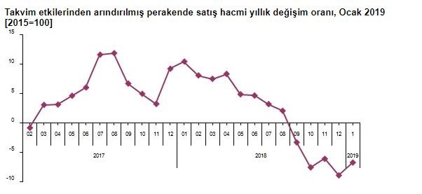Takvim etkilerinden arındırılmış cari fiyatlarla perakende ciro 2019 yılı Ocak ayında bir önceki yılın aynı ayına göre %12,1 arttı. Aynı ayda gıda, içecek ve tütün satışları %17,9, gıda dışı satışlar (otomotiv yakıtı hariç) %10,6, otomotiv yakıtı satışları %7 arttı.