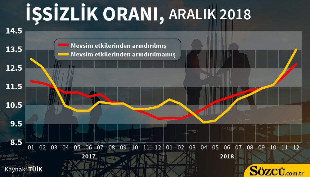 İşgücü piyasasındaki kötüleşmenin derinleşerek arttığını belirten Erkan,"İşgücü piyasasındaki kötüleşmenin derinleşerek arttığını görmekteyiz. Mevsim etkisinden arındırılmış temel işgücü göstergelerinin hemen hepsinde bozulma görülmektedir. Genç nüfus işsizliği ve tarım dışı işsizlikte de artış hızlanmış görünmektedir. Ekonominin %3 daralmış olduğu 20184Ç dönemini ham verilerle %13,5, arındırılmış verilerle %12,7 işsizlik ile kapattığımızı düşünecek olursak, daralmanın %2 civarları veya üzerinde olmasını beklediğimiz 20191Ç döneminde de işsizlik oranındaki artış trendinin devam edeceğini öngörebiliriz. Bu çerçevede ham işsizlik oranının mevsimsellik etkisiyle düşeceği ilk çeyrek sonuna kadar %14,5 seviyelerine veya üzerine doğru çıkmasını bekleriz." dedi.