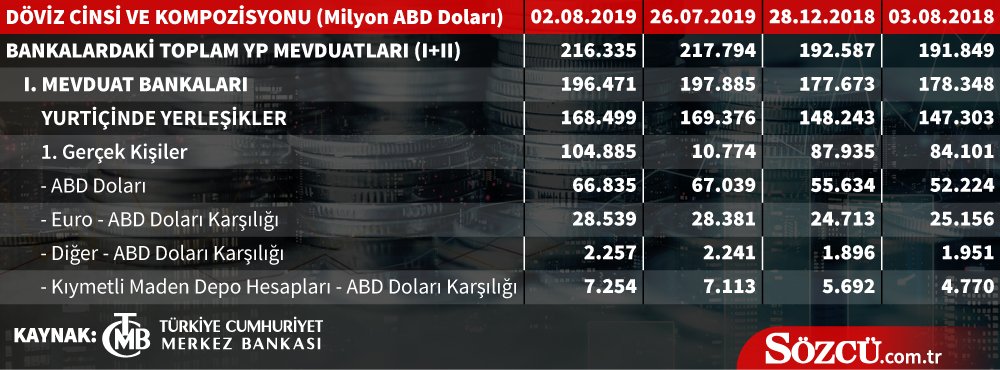 TCMB verilerine göre 5 Ekim 2018 haftasında 89.8 milyar dolar olan bireysellerin kıymetli maden dahil yabancı para mevduat ve fonları aralıksız artışın yaşandığı 6 aylıkta 20 milyar dolara yakın yükseliş gösterdikten sonra bugüne kadar da kademeli artışını sürdürdü. 5 Ekim 2018'den bugün açıklanan 2 Ağustos'a kadar bireysellerin YP mevduatlarını 27 milyar dolar artırmış oldu.