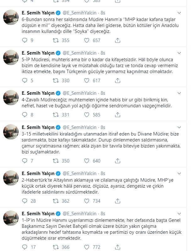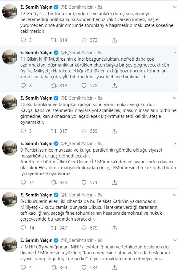 Akşener'in katıldığı bir televizyon programının ardından sosyal medya üzerinden açıklamalarda bulunan Yalçın'ın Akşener'e hakaret içeren paylaşımlarından bazıları şöyle: