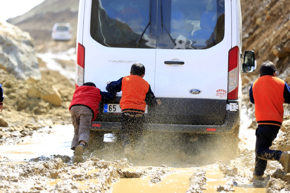 Öğrenciler, yer yer dizlerine kadar ulaşan çamurun içerisine girip, servis araçlarını itiyor.