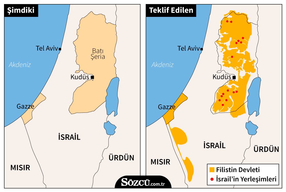 * ABD, plan dahilinde İsrail'in parçası olarak görülen topraklarda İsrail'in egemenliğini tanıyacak. Planda, İsrail'in vereceği toprak tavizlerinin gösterildiği kavramsal bir harita bulunuyor.