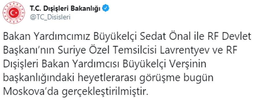 Bakanlık tarafından Twitter’da yapılan paylaşımda “Bakan Yardımcımız Büyükelçi Sedat Önal ile RF Devlet Başkanı'nın Suriye Özel Temsilcisi Lavrentyev ve RF Dışişleri Bakan Yardımcısı Büyükelçi Verşinin başkanlığındaki heyetlerarası görüşme bugün Moskova'da gerçekleştirilmiştir” denildi.