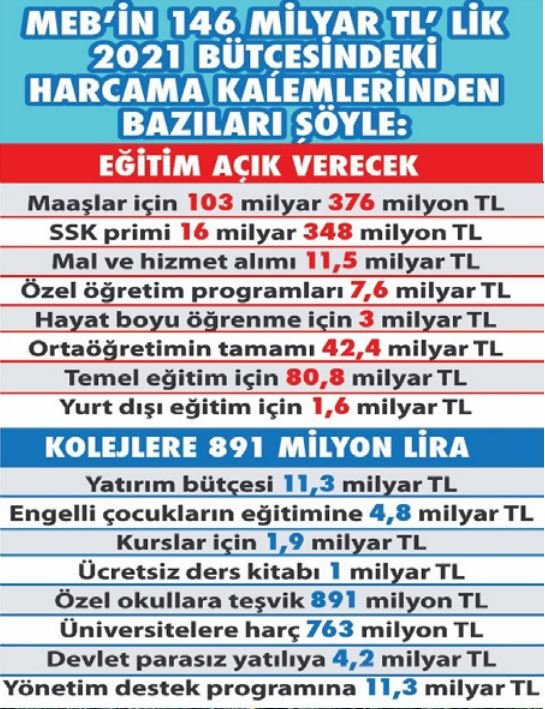 Din Öğretimi Genel Müdürlüğüne 2020’de 9.9 milyar TL, 2021’de 10. 6 milyar TL ayrıldı.MEB, köyden kente 1 milyon 156 bin öğrencinin taşınması için kendi bütçesinden 5.5 milyar TL ayırdı. Ayrıca ek olarak, Sosyal Yardımlaşma Fonu’ndan da taşımalı sisteme 2 milyar 950 milyon TL ile ve pansiyonlardaki 328 bin öğrenci için de 1.3 milyar TL ödenecek. Böylece, kapatılan 17 bin köy okulu açılamadığından 2021’de de taşımalı eğitim için 9 milyar 750 milyon TL daha harcanacak.