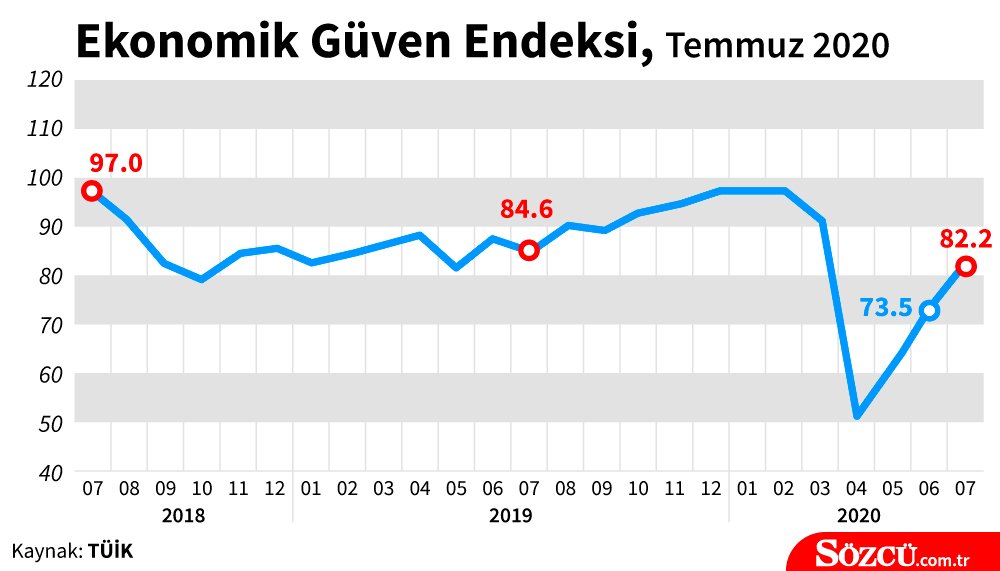 Reel kesim güven endeksi aylık bazda yüzde 10.7 artarak 99.4 değerini, hizmet sektörü güven endeksi yüzde 20.2 artarak 66.7 değerini, perakende ticaret sektörü güven endeksi yüzde 9.6 artarak 94.6 değerini, inşaat sektörü güven endeksi yüzde 11.6 artarak 87.0 değerini aldı. Tüketici güven endeksi Temmuz ayında yüzde 2.7 azalarak 60.9 değerini aldı.