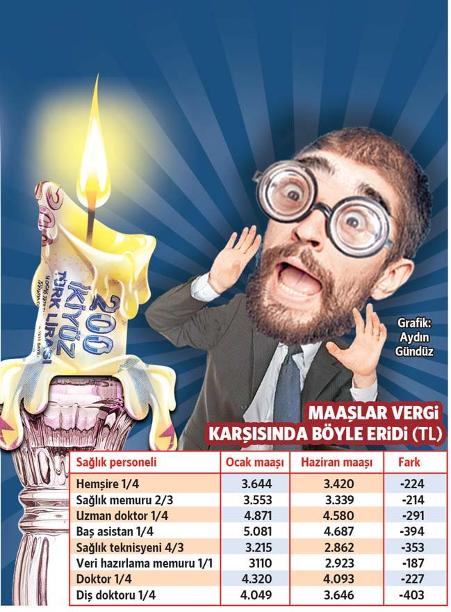 Aynı şekilde ocak ayında 5 bin 81 lira alan baş asistanın maaşı haziran ayında 394 lira birden düşerek 4 bin 687 liraya geriledi. Diş doktoru da vergi artışı yüzünden maaşından 403 lira kayba uğradı. Genel Sağlık-İş Başkanı Zekiye Bacaksız, kamu çalışanlarının temmuzda alacakları yüzde 4’lük zammın daha cebe girmeden haziran ayında vergi dilimine gittiğini belirterek, verginin yüzde 15’i aşmamasını önerdi.