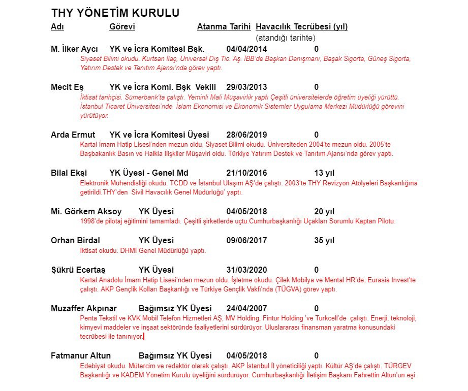 Türkiye’nin en değerli kuruluşları arasında yer alan THY yönetiminin havacılık tecrübesi olmaması şaşırtıyor.Sivil Havacılık Eski Genel Müdür Yardımcısı Oktay Erdağı, THY Yönetim Kurulu’ndaki bir başka garipliği de şöyle aktarıyor: “Bilal Ekşi Sivil Havacılık Genel Müdürü olarak görev yaparken tüm şirketlerin sırlarına hakim oldu. Bu kişinin tekrar THY’de yönetici yapılması doğru değildir.”
