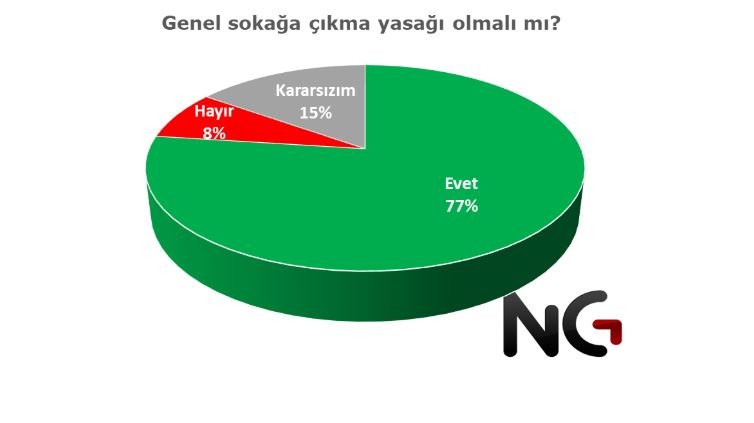 Araştırmaya katılanlara, genel sokağa çıkma yasağı ilan edilmeli mi diye sorduğumuzda evet diyenlerin oranı %77 çıktı. Genel bir sokağa çıkma yasağı ilan edilmesi görüşüne katılmayanların oranı %8 olurken bu konuda kararsız olanların oranı ise %15.