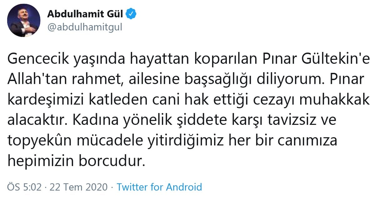 * Gencecik yaşında hayattan koparılan Pınar Gültekin'e Allah'tan rahmet, ailesine başsağlığı diliyorum.