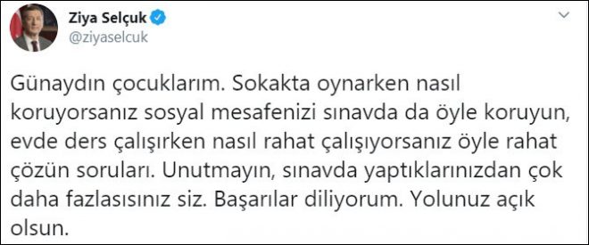 Milli Eğitim Bakanı Ziya Selçuk da ''Günaydın çocuklarım. Sokakta oynarken nasıl koruyorsanız sosyal mesafenizi sınavda da öyle koruyun, evde ders çalışırken nasıl rahat çalışıyorsanız öyle rahat çözün soruları. Unutmayın, sınavda yaptıklarınızdan çok daha fazlasınız siz. Başarılar diliyorum. Yolunuz açık olsun'' dedi.