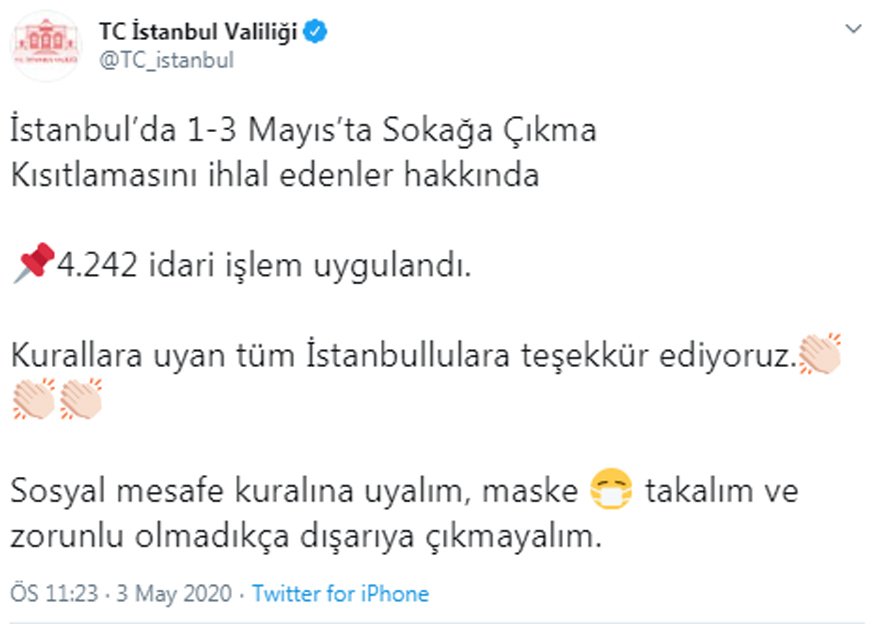 Valilik, sosyal mesafeye uyma konusunda vatandaşları uyararak, “İstanbul’da 1-3 Mayıs’ta Sokağa Çıkma Kısıtlamasını ihlal edenler hakkında 4.242 idari işlem uygulandı. Kurallara uyan tüm İstanbullulara teşekkür ediyoruz. Sosyal mesafe kuralına uyalım, maske takalım ve zorunlu olmadıkça dışarıya çıkmayalım” ifadelerini kullandı.